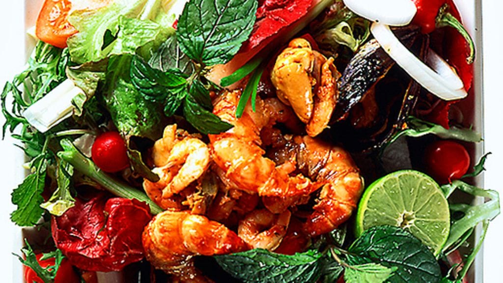 3. Kuumenna öljy kattilassa. Laita sinisimpukat ja kampasimpukat kattilaan ja anna rätistä 5 minuuttia. Lisää jättikatkaravut ja paista minuutti, tai kunnes katkaravut ovat vaaleanpunaisia ja sinisimpukat ovat avautuneet. Heitä pois simpukat, jotka eivät avaudu. Jaa lautasille keitetyt äyriäiset ja tiputtele kastiketta päälle. Koristele limettilohkoilla ja basilikanlehdillä.