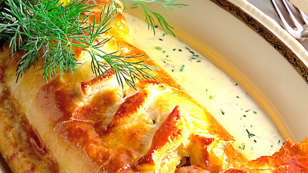 1. Kauli kaksi voitaikinalevyä yhteen ja leikkaa kummastakin kaulitusta levystä iso pyörylä. Leikkaa merianturafileet kahtia ja nosta kummankin voitaikinapyörylän toiselle puolikkaalle neljä kalapalaa niin, että pyörylöihin jää noin 2 cm reuna. Levitä kalapalojen päälle katkaravut ja simpukat ja pirskottele mausteeksi sitruunamehua ja valkoviiniä. Suikaloi purjo ja hienonna salottisipuli ja tilli. Levitä kasvikset päällimmäiseksi ja mausta suolalla ja pippurilla. Käännä pyörylän tyhjä puolikas täytteen päälle ja painele reunat huolellisesti yhteen.
