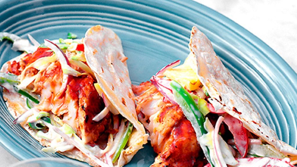 4. Kuumenna leivät pakkauksen ohjeen mukaan. Tarjoile kalat sipuli, kaalin ja ananaksen kera tortilloista. Norota päälle kastiketta.