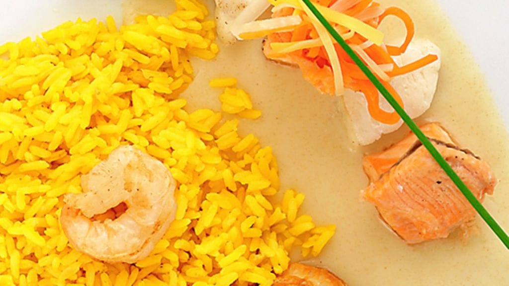 1. Kiehauta sahramilla maustettu vesi. Lisää riisi ja keitä pakkauksen ohjeen mukaan.