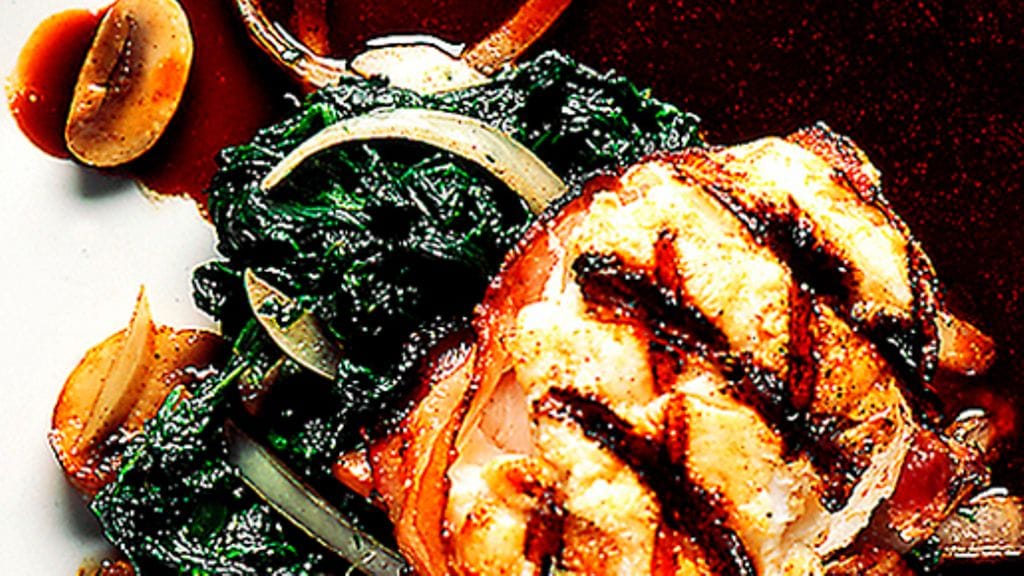 3. Keitä viiniä kokoon, niin että puolet on jäljellä ja liuota kanaliemikuutio kiehuvaan viiniin. Kiillota kastike voinokareella. Lusikoi kastike peiliksi lämpimille lautasille. Jaa pinaattiseos lautasille ja nosta päällimmäiseksi kalamedaljongit.
