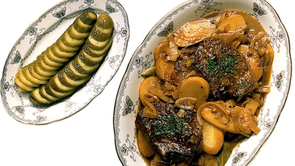 3. Keitä hiljalleen kannen alla n. 45 minuuttia. Ripottele päälle hienonnettua persiljaa ennen tarjoilua. Tarjoile viipaloidun suolakurkun kera.