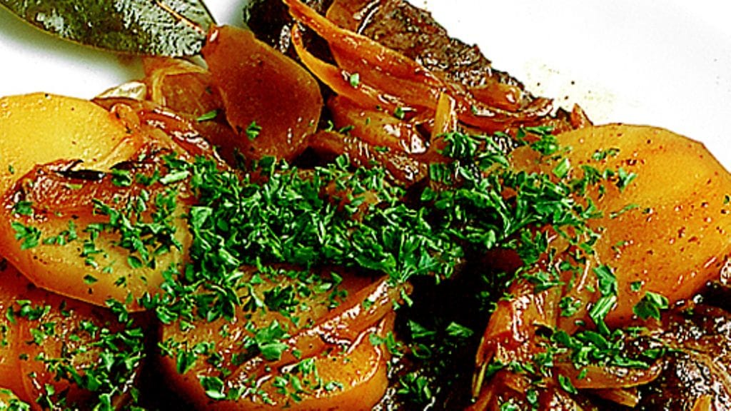 1. Nuiji lihaviipaleet kevyesti. Kuori perunat ja leikkaa ne puoli senttiä paksuiksi viipaleiksi. Paista sipuli läpikotaisin voissa paistinpannussa ja ruskista liha samalla tavalla.