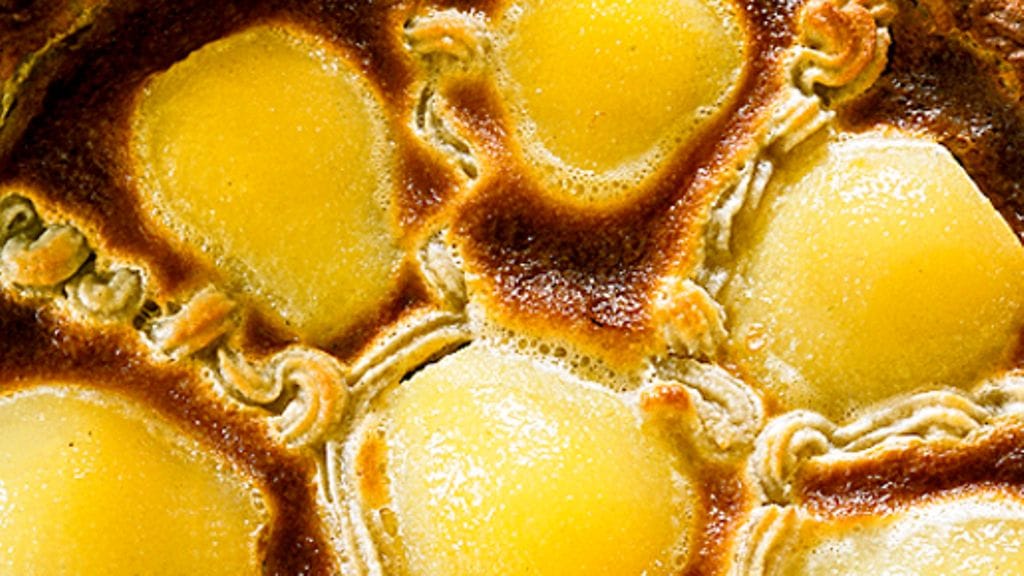 2. Laita päärynänpuolikkaat piiraskuoreen. Vatkaa kerma, sekoita munaan kananmunat, sokeri ja maizena. Vatkaa valkuaiset ja sekoita mantelimassan kera. Pursota massa vuoan reunalle ja päärynöiden väliin. Kaada päälle kreemi. Paista kypsäksi 175 asteessa kunnes kreemi on jähmettynyt.