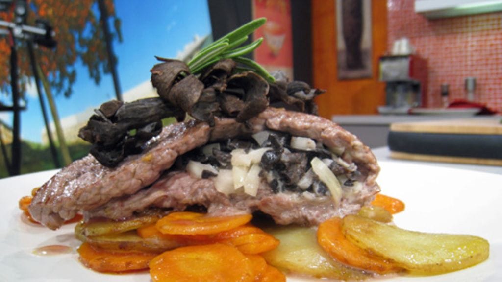 Leikkaa liha poikkisyin ohuiksi pihveiksi ja nuiji ne lehtipihveiksi. Silppua sienet ja sipuli ja mausta ne suolalla. Anna suolan itkettää sieni-sipuliseosta hetki ja purista ylimääräinen vesi pois.