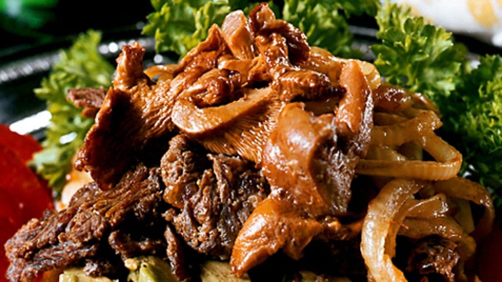 3. Laita uutta voita pannuun ja paista leipäviipaleet rapeiksi ja kullanruskeiksi. Asettele ne lämpimille lautasille ja laita päälle avokadoa, hirvenkäristystä, sipulia ja sieniä. Koristele paprikalla ja persiljalla.