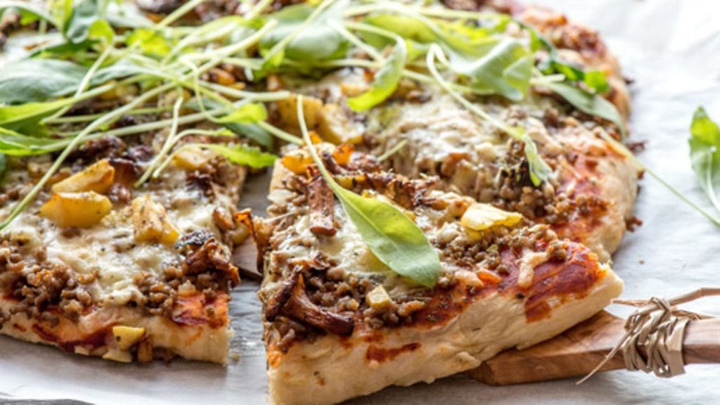 Levitä pinnalle tomaattipyree tai punainen pestokastike. Ripottele päälle juustoraaste.