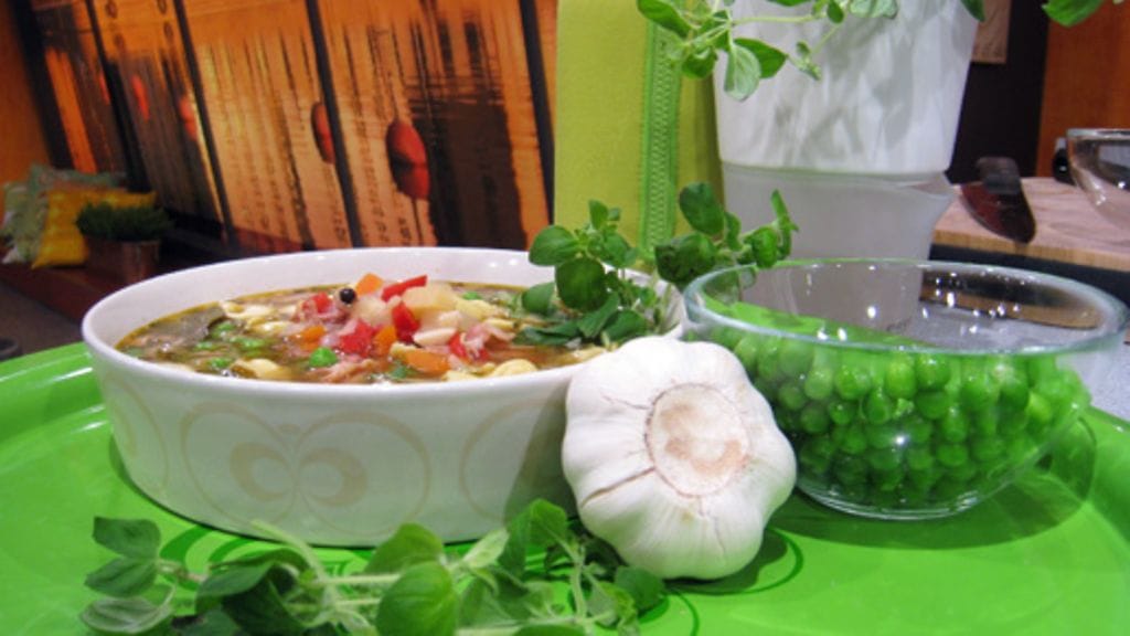 Lisää runsaasti vettä, liemikuutiot, pippurit, laakerinlehdet ja oreganoa. Kaada pastat kiehuvaan liemeen ja keitä lähes kypsäksi. Kumoa lopuksi mukaan myös herneet.