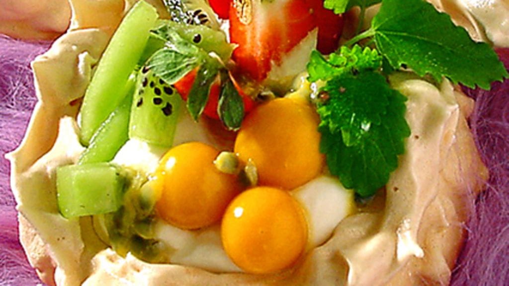 3. Kumoa marengit vadille ja poista leivinpaperit. Käännä marengit taas toisinpäin toiselle vadille. Täytä kermavaahdolla ja koristele hedelmillä ja marjoilla.