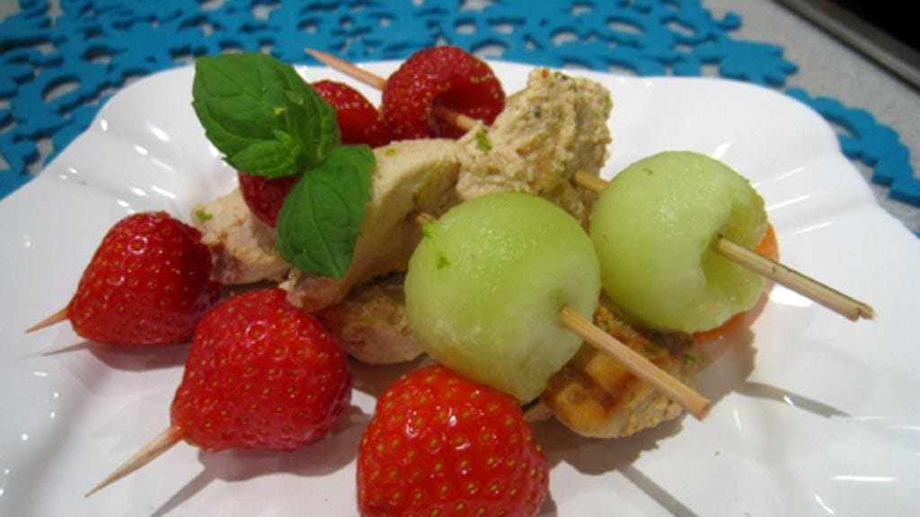 Ota melonista palloja meloniraudalla tai kuutioi meloni. Puhdista (ja puolita) mansikat. Pujota coctailtikkuihin vuorotellen broileria, melonia ja mansikoita.
