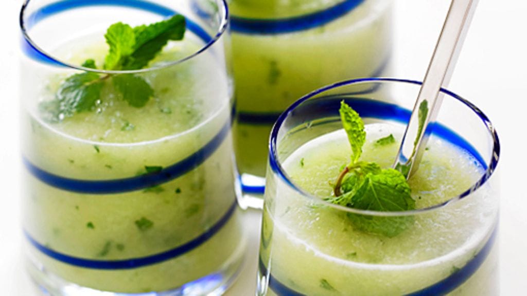 1. Kuori meloni ja raaputa pois siemenet. Leikkaa meloni isohkoiksi paloiksi. Laita meloni, sokeri, vesi, sitruunamehu ja mintunlehdet mikseriin. Pyöritä kovimmalla nopeudella sileäksi seokseksi.