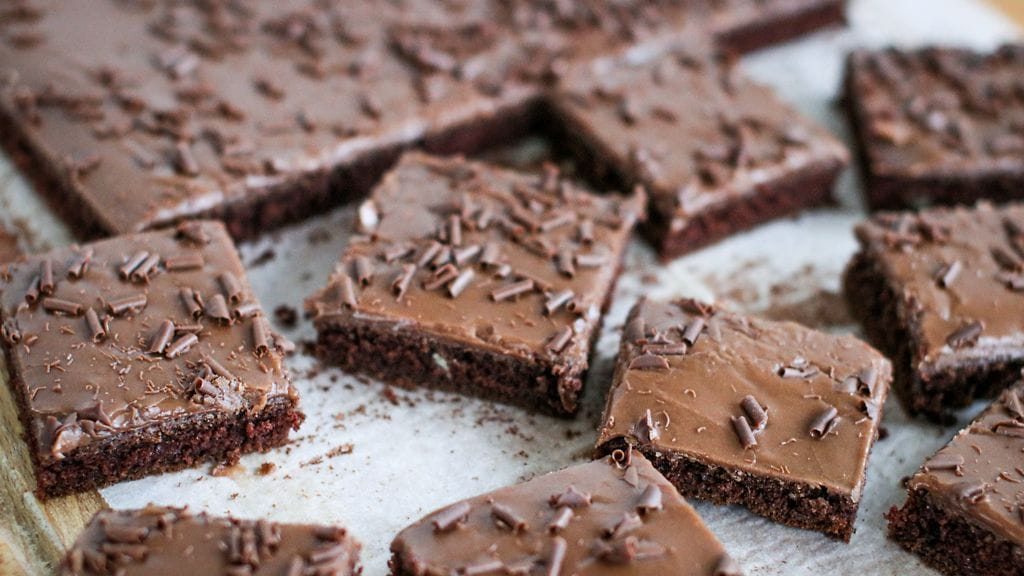 - Valmista kuorrute sulattamalla voi, lisää kaakaojauhe ja kahvi sekä tomusokeri. Sekoita sileäksi ja kaada hetken hengähtäneen piirakan päälle.