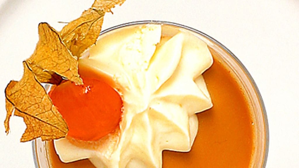 2. Laita liivatelehdet likoamaan kylmään veteen 5 minuutiksi. Poimi vaniljatanko kermasta. Purista liivatteista ylimääräinen vesi ja laita ne kuumaan kermaseokseen, sekoita kunnes ne ovat sulaneet. Kaada seos vedellä huuhdeltuihin annosvuokiin. Anna jähmettyä jääkaapissa vähintään 4 tuntia.