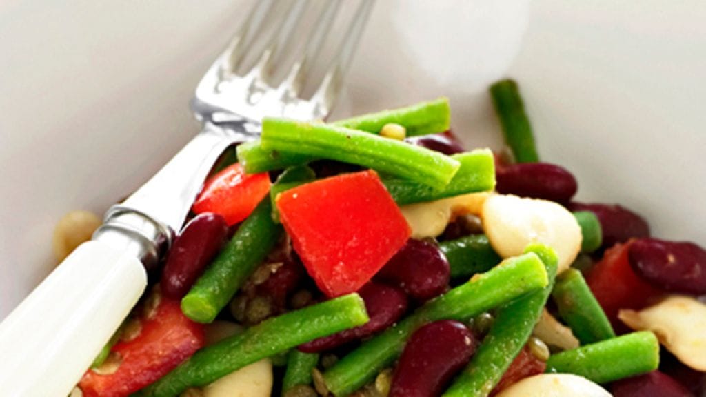 1. Jaa jokainen tomaatti neljään lohkoon, poista siemenet, mutta säästä ne sivuun. Leikkaa jokainen siemenetön tomaattilohko puoliksi ja pane kulhoon yhdessä valkoisten papujen, kidneypapujen ja linssien kanssa. Keitä 1,5 litraa suolattua vettä kattilassa, katkaise vihreät pavut keskeltä puoliksi ja ryöppää niitä yksi minuutti. Kaada ne lävikköön, huuhtele nopeasti kylmällä vedellä ja lisää papu-tomaattiseokseen.