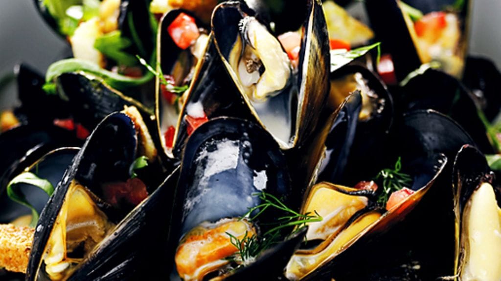 2. Kuumenna ison kattilan pohjalla oliiviöljyä, ja kuullota sipulisilppuja siinä ruskistamatta. Lisää kattilaan simpukat, sekoita ja lisää viini ja kerma. Keitä kannen alla, kunnes simpukat ovat avautuneet, noin 2 minuuttia. Mausta suolalla ja pippurilla.
