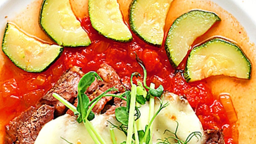 2. Kuumenna uuni 275 asteeseen. Laita liha voideltuun, uuninkestävään vuokaan. Laita päälle muutama viipale mozzarellajuustoa ja gratinoi uunissa 15 minuuttia.