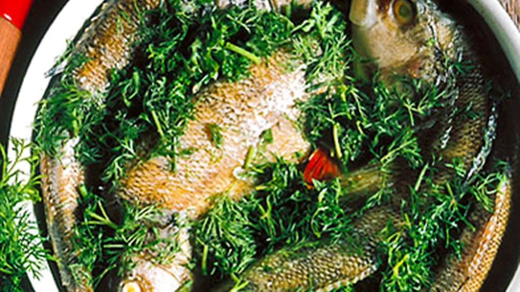 2. Voitele pata ja laita kalat pataan selät ylöspäin. Sekoita jauho veteen ja kaada kalojen päälle. Lisää mausteet ja yrttisilput. Keitä hiljaa kypsiksi, noin 15 minuuttia.