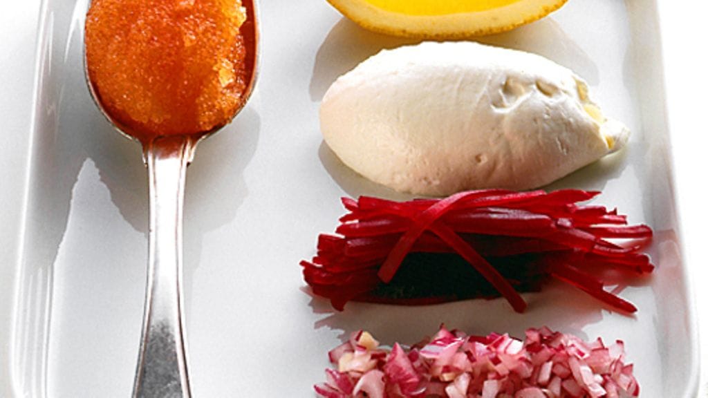 3. Ota lusikalla smetanasta munanmuotoisia nokareita ja aseta ne tarjolle yhdessä muikunmädin, punasipulisilpun ja punajuurisuikaleiden sekä sitruunalohkojen kanssa.