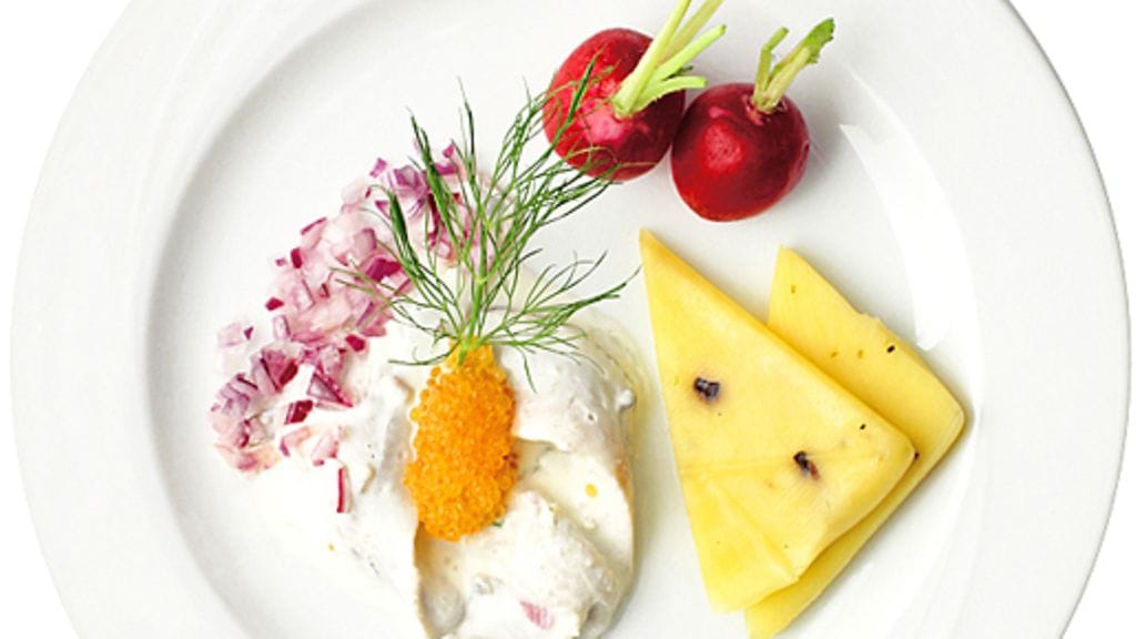 3. Asettele silakat 4 lautaselle. Viipaloi maustettu juusto ja asettele lautasille. Koristele hienonnetulla punasipulilla, retiiseillä ja muikunmädillä. Koristele tillillä.