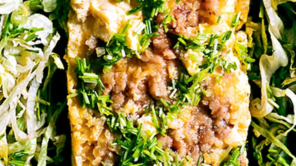 4. Laita vuoka vesihauteeseen, peitä foliolla, johon pistät muutaman höyryreiän. Paista noin 30 minuuttia. Kumoa jäähtyneenä vadille, koristele ruohosipulilla.