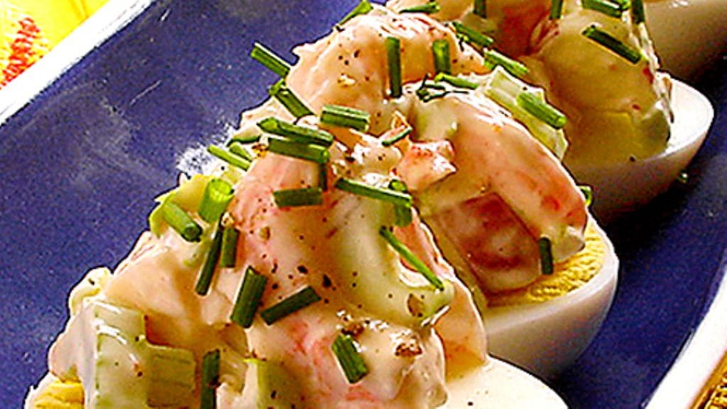 3. Kuori ja halkaise munat, koristele rapuseoksella. Asettele päälle kokonainen katkarapu. Koristele ruohosipulilla.
