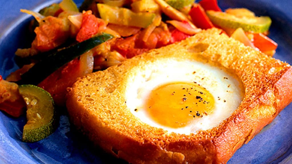 3. Käännä viipaleet ja riko muna joka syvennykseen. Paista leipiä miedolla lämmöllä, kunnes muna on hyytynyt. Mausta suolalla ja pippurilla ja tarjoile heti kuuman vihannessalaatin kanssa.