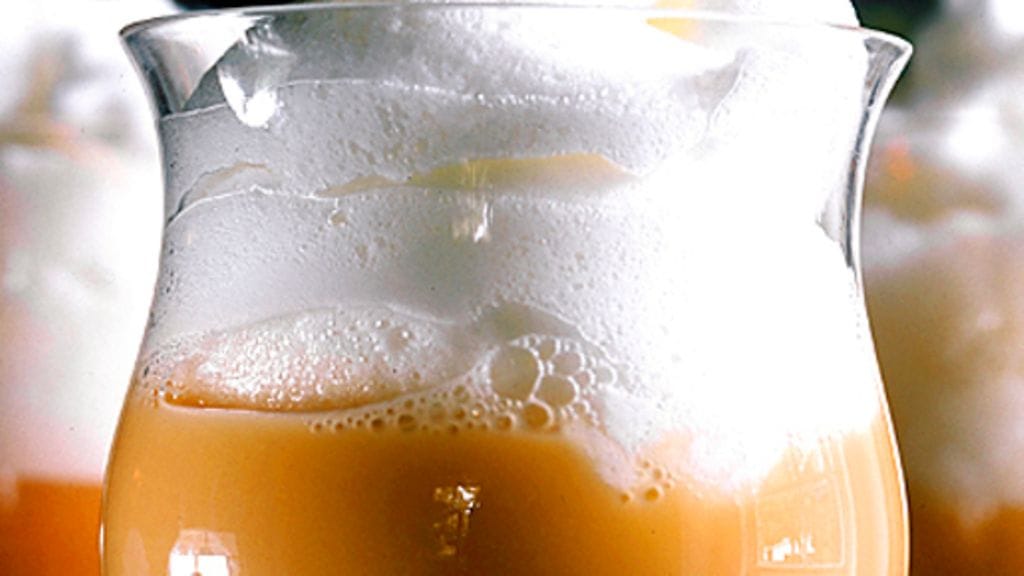 1. Erottele munan valkuainen ja keltuainen. Vatkaa keltuainen ja sokeri lusikalla suoraan lasissa kunnes seos sakenee. Lisää halutessasi konjakki ja jatka vatkaamista.