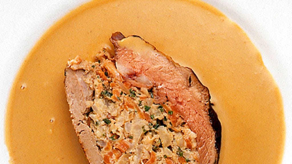 1. Puhdista ja huuhdo porkkana, palsternakka, purjo ja sipuli. Suikaloi ½ porkkana, koko palsternakka ja pala purjoa. Paista suikaleet kevyesti nokareessa voita. Anna jäähtyä. Kuumenna uuni 175 asteeseen. Sekoita jauheliha, muna, vesi, salaattimauste, 1 tl suolaa ja 1 maustemitta vastajauhettua valkopippuria. Lisää juuressuikaleet. Leikkaa vasikanrintaan tasku, täytä tasku jauhelihaseoksella. Sulje tasku 5-6 hammastikun avulla kiinni.