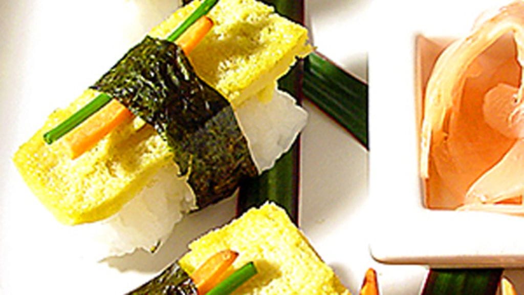 1. Sekoita munat, sokeri ja suola haarukalla kulhossa. Voitele vuoka huolellisesti öljyllä ja kaada munakasseos siihen. Paista 200-asteisessa uunissa 12-15 minuuttia. Jäähdytä munakas ja leikkaa se neljään 2x4 cm:n kokoiseen palaan.