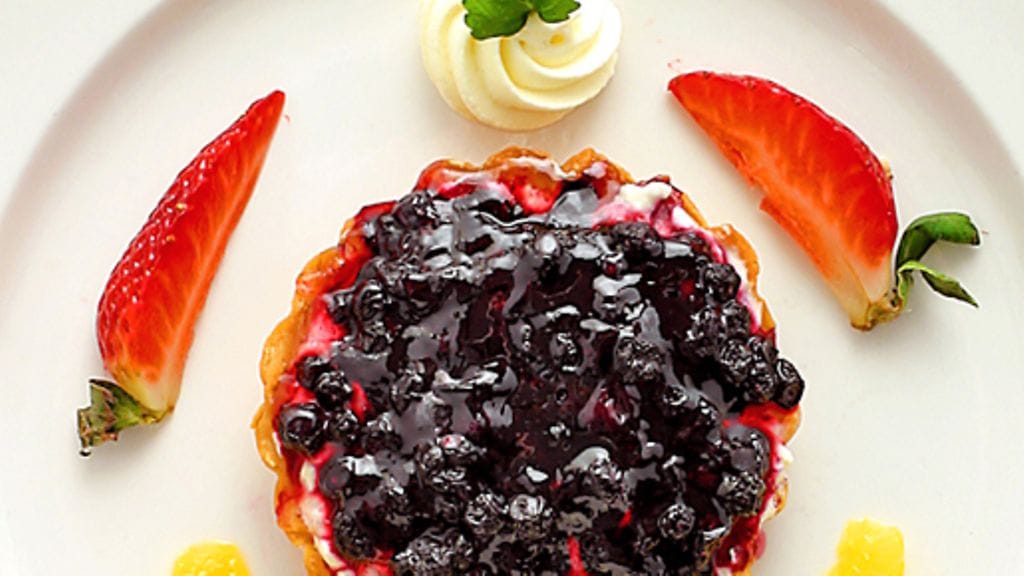 3. Sulata hyytelö. Täytä taikinakuoret sitruunakermalla ja levitä sen päälle mustikat. Sivele lämpimällä hyytelöllä ja anna sen hyytyä.