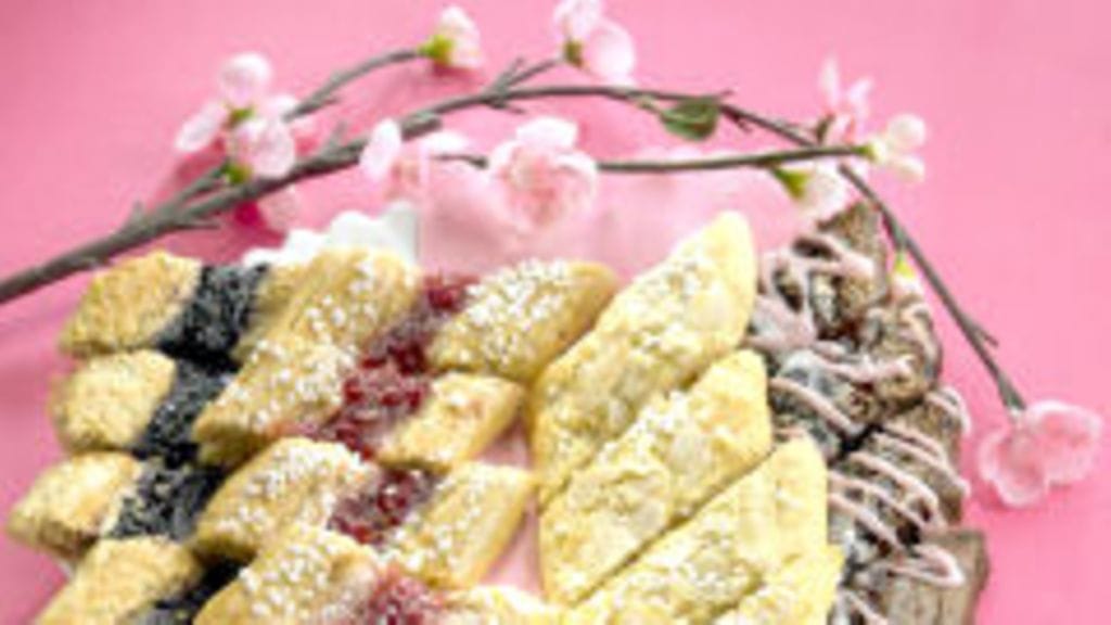 Täytä pitkä vako reilusti paiston kestävällä mustikkamarmeladilla. Paista 200-asteisen uunin keskitasolla 8-10 min. Leikkaa muutaman minuutin kuluttua uunista ottamisen jälkeen tangot terävällä veitsellä vinoiksi suorakaiteiksi.