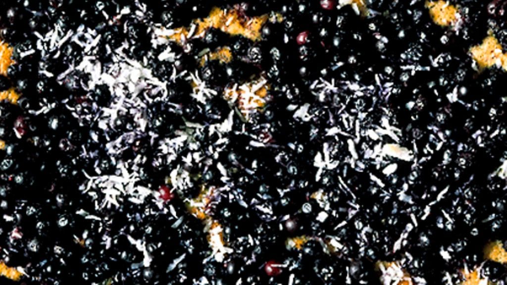 5. Ota vuoka uunista, levitä päälle marjoja ja kookosta ja laita kakku uudelleen uuniin kunnes marjat mehustuvat ja kakku on kypsä.