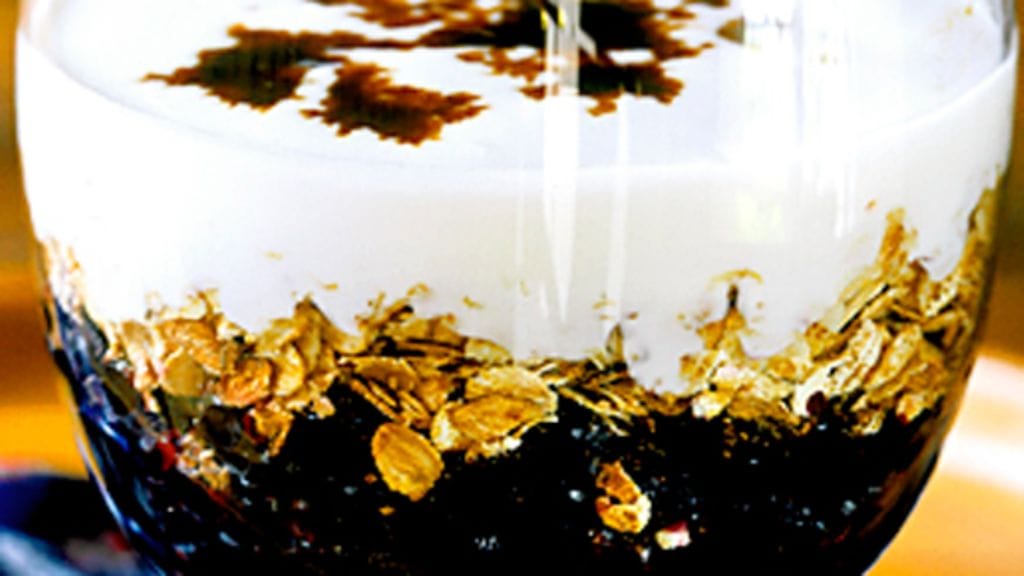 2. Laita mustikat lasiin, peitä kaurahiutaleilla, lisää jogurttia ja viimeistele fariinilla.