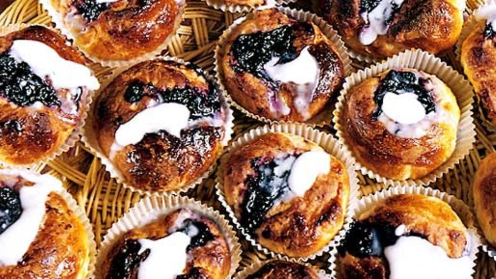 3. Penslaa pullat kananmunalla ja paista uunin keskitasolla 8-10 minuuttia. Anna jäähtyä ritilällä. Sekoita kuorrutus ja kuorruta kun pullat ovat jäähtyneet.