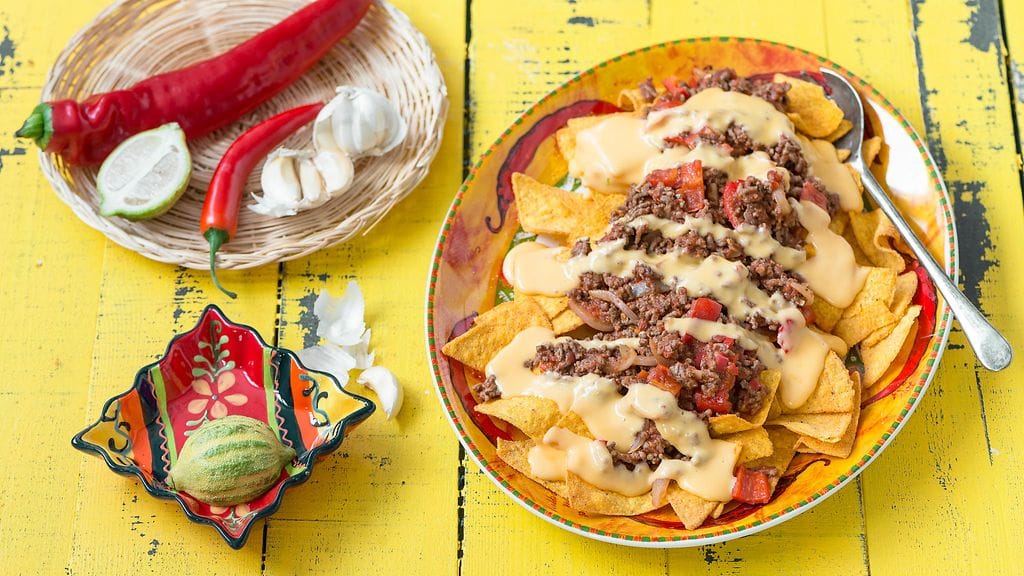 Laita nachot leivinpaperilla vuoratulle uunipellille tai uunivuokaan. Levitä päälle jauhelihaseos ja kaada päälle juustokastike. Tarjoa raikkaan salaatin, guacamolen ja smetanan kanssa.