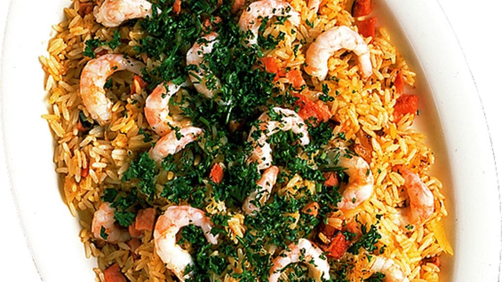 2. Lisää keitetty riisi, kinkku, currytahna, korianteri, juustokumina ja suola. Paista kunnes riisi saa väriä. Sekoita riittävän usein.