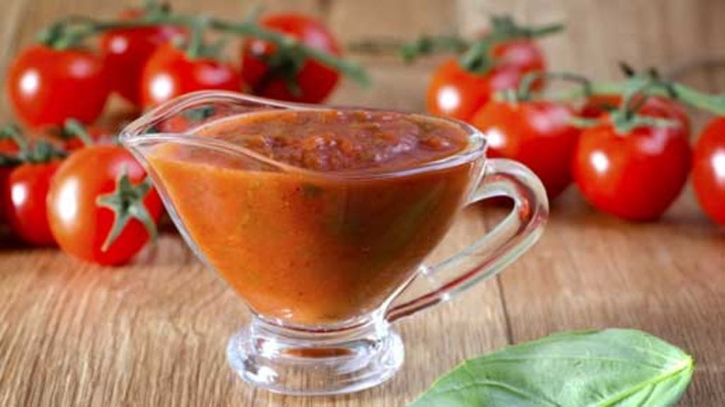 2. Kuori, hienonna ja paista sipuli ja valkosipuli oliiviöljyssä. Lisää tomaattimurska ja keitä kokoon miedolla lämmöllä 10-15 minuuttia. Mausta suolalla, pippurilla ja halutessasi ripauksella sokeria, jos tomaatit ovat happamia.