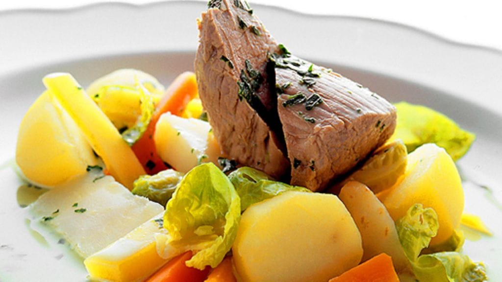 2. Lisää nyt kattilaan kokonainen sipuli ja puolet porkkana-, palsternakka- ja sellerikuutioista. Anna kaikkien ainesten kiehua noin tunti, tai kunnes liha on oikein mureaa. Ota lihapalat liemestä ja siivilöi liemi, heitä kiehuneet juurekset pois. Keitä lientä, kunnes siitä on jäljellä noin puolet. Keitä loput juureskuutiot sekä perunat kypsiksi liemessä. Laita lihapalat toiseen pataan kypsien juuresten ja perunoiden kanssa. Keitä ruusukaalit kypsiksi miedosti suolatussa vedessä.