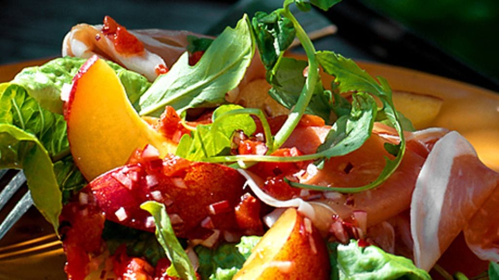 1. Jaa kinkkuviipaleet puoliksi, huuhdo salaatinlehdet, lohko nektariinit. Halkaise granaattiomena ja kaavi esiin siemenet.