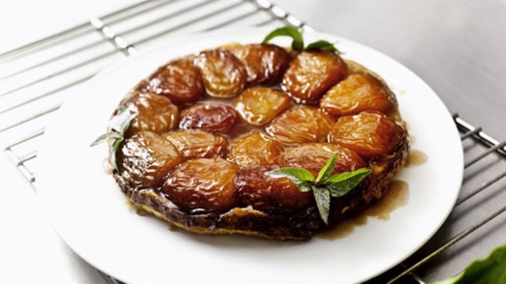Anna vetäytyä vähintään puoli tuntia. Kumoa valmis tatin tarjoilulautaselle. Koristele maustetulla tomusokerilla ja tarjoa lämpimänä jäätelön tai sorbetin kanssa.