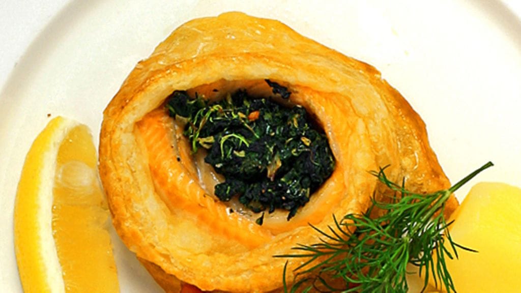 3. Leikkaa voitaikinalevyt 5 cm levyisiksi suikaleiksi niin että ne ovat tarpeeksi pitkiä ulottuakseen kalojen ympärille. Penslaa voitaikina keltuaisella ja kääri kalojen ympärille voideltu puoli ulospäin. Täytä renkaat kylmällä pinaatilla ja paista uunissa 12 minuuttia.