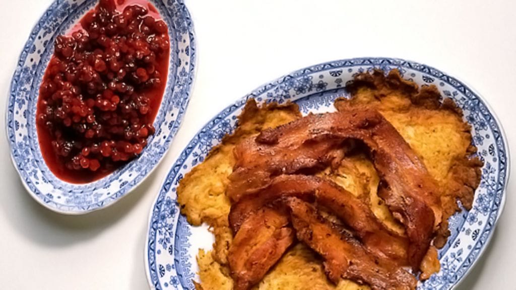 3. Tarjoile jokainen lettu heti paistamisen jälkeen rapean läskin ja raikkaan puolukkasurvoksen kanssa.