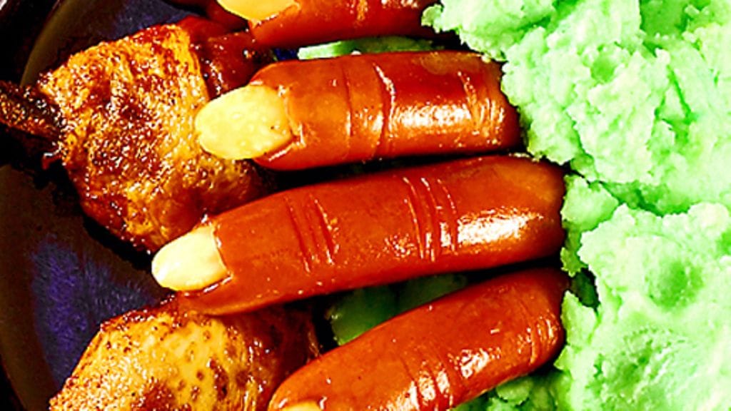 3. Noidansormet: Leikkaa nakkeihin muutamia viiltoja, jotka esittävät ihon poimuja. Paina ”sormien” päihin mantelit kynsiksi, paista nakit.