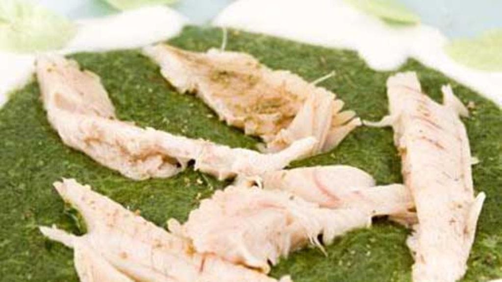 Pese ja poista varret nokkosten lehdistä ja pinaatinlehdistä. Kaada lehdet keskikokoiseen kattilaan ja lisää kanaliemi sekä kerma. Anna keiton kuumeta kiehuvaksi kohtalaisella lämmöllä ja keitä sitten hiljalleen noin 10 minuuttia. Kun nokkosen ja pinaatin lehdet ovat täysin pehmeät ja nokkosen polttiaiskarvoja ei enää tunnu, kaada keitto esim. tehosekoittimeen ja soseuta se tasaiseksi. Kaada takaisin kattilaan ja lämmitä uudelleen matalalla lämmöllä. Lisää suolaa maun mukaan. Kaada tarjoiluastioihin ja ripottele päälle muskottia ja rosmariinia. Irrota kalasta nahka ja nypi ruodot. Paloittele kala helposti syötäviksi annospaloiksi ja asettele kauniisti keiton päälle. Viimeistele annokset pienellä määrällä jukurttia ja tarjoa heti.