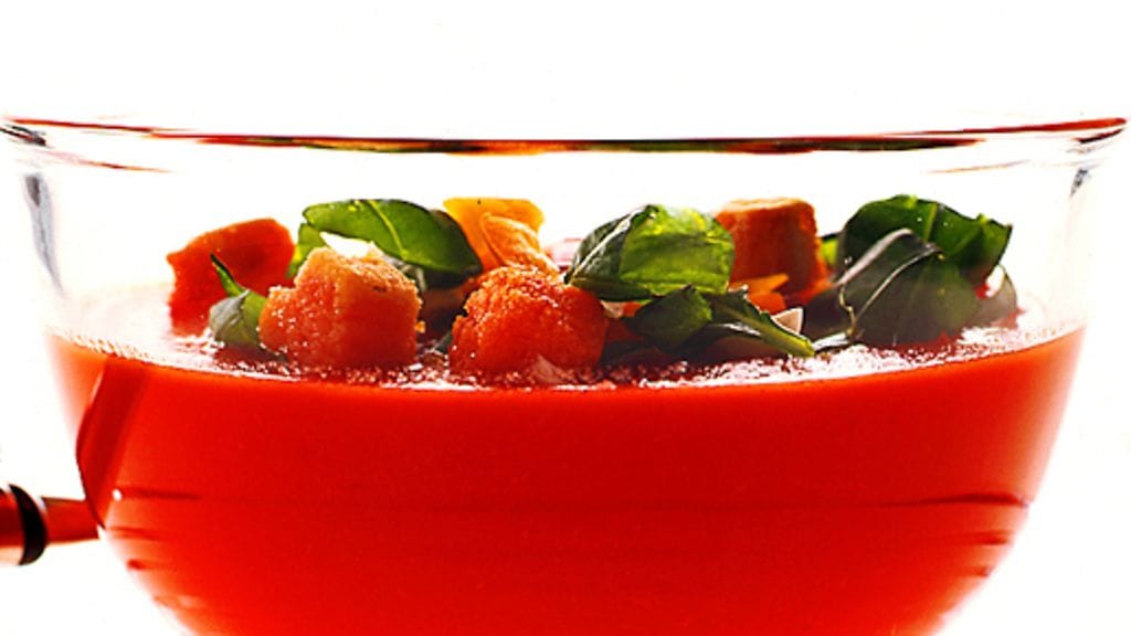 3. Suikaloi basilika ja koristele keitto juuri ennen tarjoilua basilikalla ja paistetuilla leipäkuutioilla.