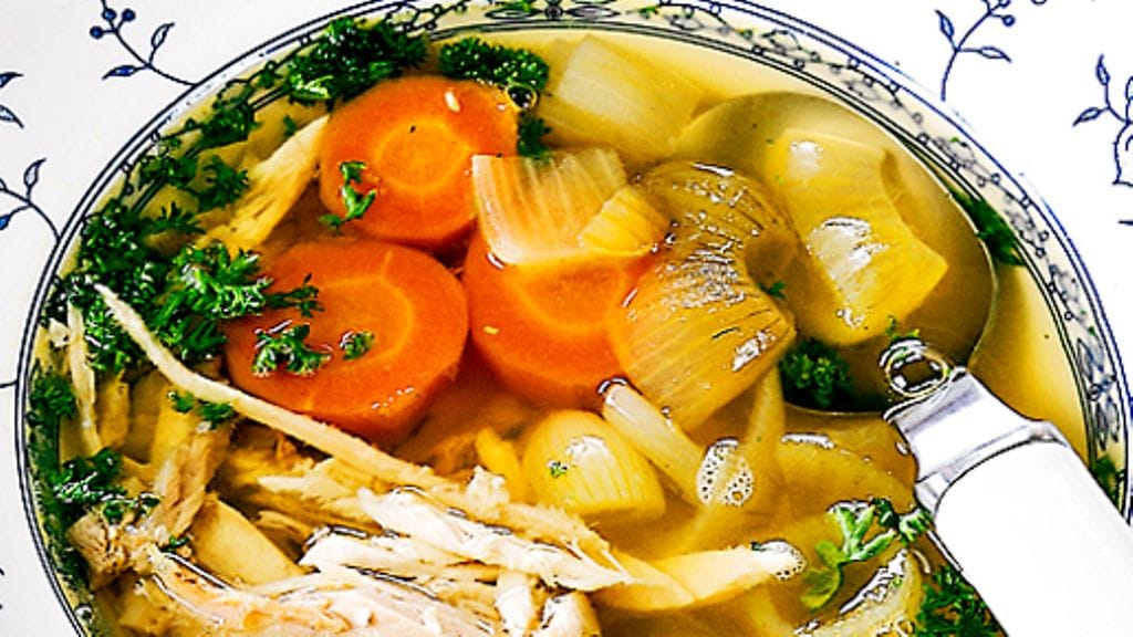 1. Kiehauta kanaliemi, lisää vihannekset ja mausteet. Keitä hiljaa, kunnes vihannekset ovat sopivan pehmeitä.