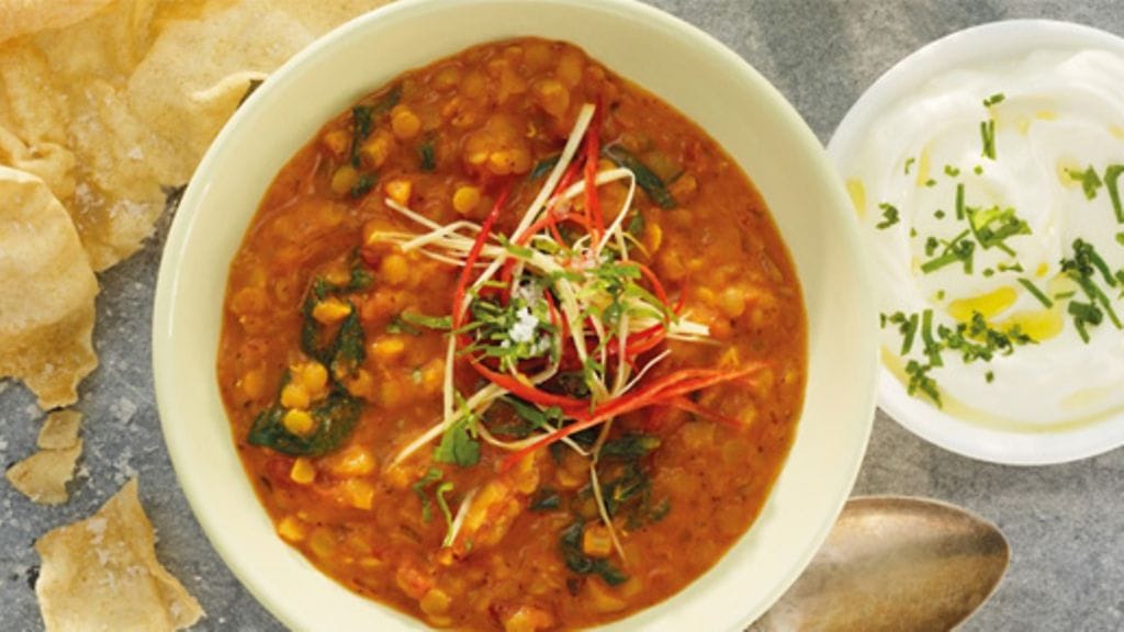 2. Lisää linssit ja kasvisliemi. Sekoita tomaattimurska, kerma, sitruunamehu ja raastettua inkivääriä liemeen. Mausta mango chutneylla sekä tarvittaessa suolalla ja pippurilla.