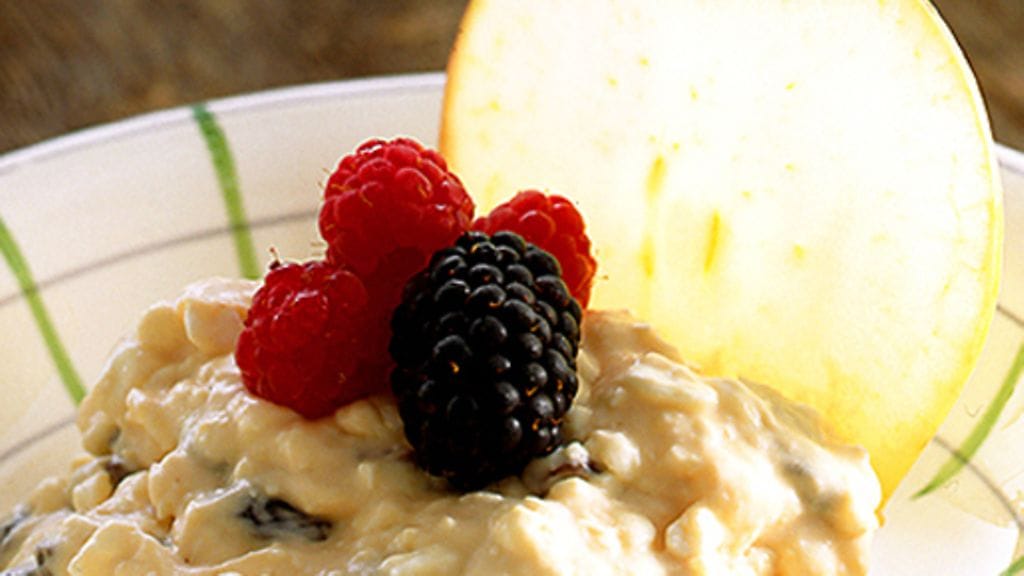 2. Sekoita raejuusto, keltuainen, sokeri ja rusinat.