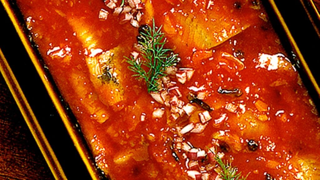 2. Hienonna punasipuli. Leikkaa fileet 1 cm paloiksi ja kaada päälle marinadi. Koristele punasipulilla ja tillillä.