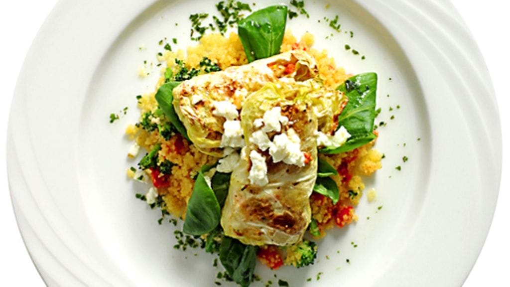 2. Kaalikääryleet: Lämmitä uuni 225 asteeseen. Kasta kaalinlehdet nopeasti kiehuvassa vedessä ja huuhtele ne sitten jääkylmässä vedessä. Levitä lehdet pöydälle ja laita niille täytettä. Rullaa lehdet kääryleiksi ja pane ne uunivuokaan liitoskohta alaspäin. Kypsennä uunissa noin 15 minuuttia. Murenna kääryleiden päälle fetajuustoa ennen tarjoilua.